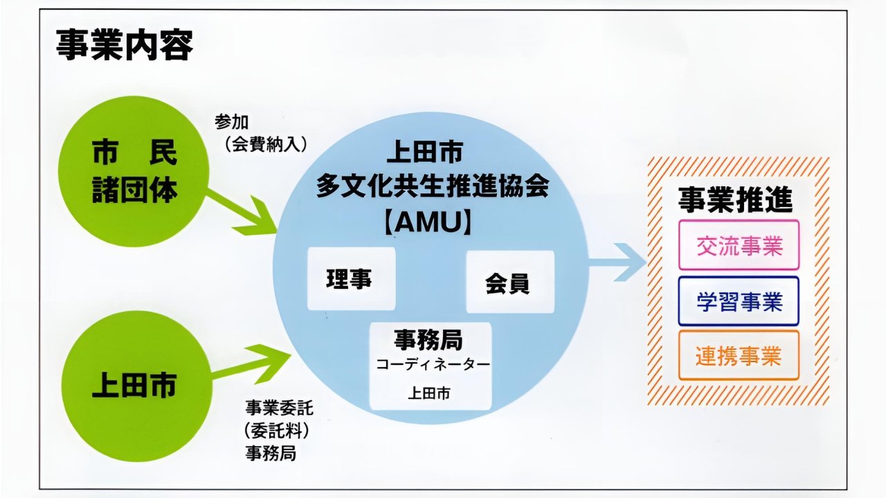 「上田市多文化共生推進協会」(英文名:Association for Multicultural community building of Ueda 略称:AMU)は、上田市内に暮らす国籍・民族や文化・言語などの異なるすべての人々が、同じ地域の住民として互いに認め合い、尊重しあって豊かに暮らすことのできる社会(多文化共生社会)を形成するために設立された組織です。